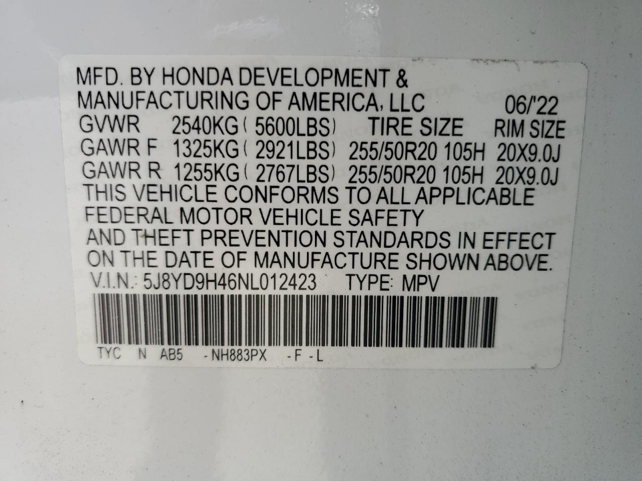 Колір БілийЦиліндри 6VIN 5J8YD9H46NL012423Стан Заводиться та їде (перевірено)Ушкодження Передня або задняДата аукціону 2025-11-07