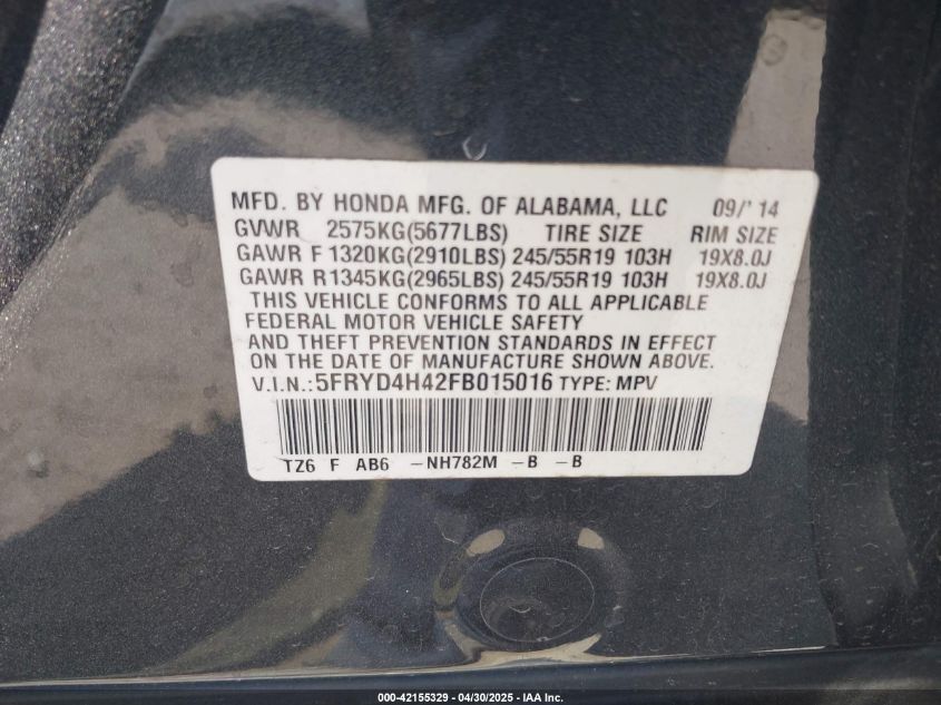 Колір СірийЦиліндри 6Привід Повний привідVIN 5FRYD4H42FB015016Стан СтаціонарноУшкодження Права сторона