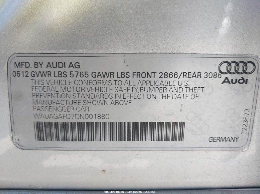 Колір СрібнийЦиліндри 6Привід Повний привідVIN WAUAGAFD7DN001880Стан СтаціонарноУшкодження Передня або задня