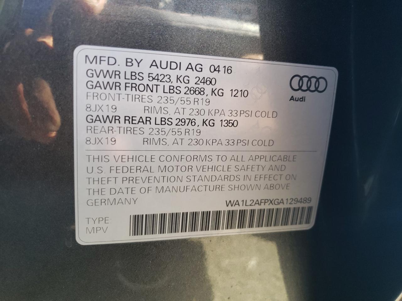 AUDI Q5 2.0 2016 р.в., Повний привід (WA1L2AFPXGA129489) з США
