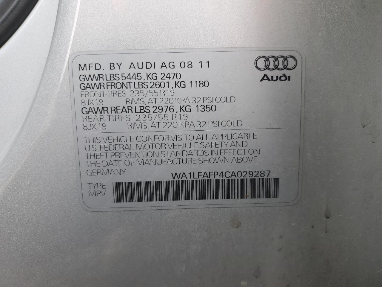 Колір СрібнийЦиліндри 4Привід Повний привідVIN WA1LFAFP4CA029287Стан Заводиться та їде (перевірено)Ушкодження Передня або задняДата аукціону 2025-11-05
