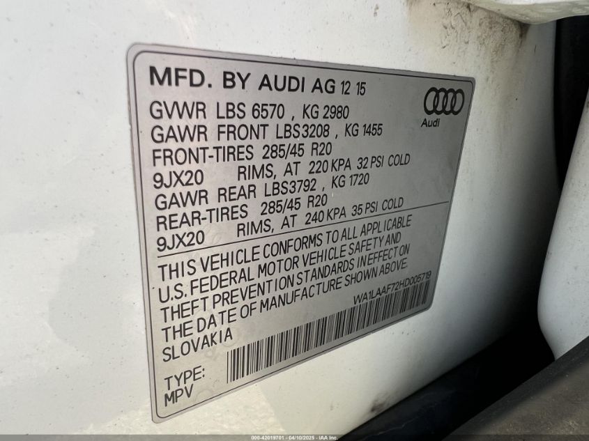 AUDI Q7 3.0 2017 р.в., Повний привід (WA1LAAF72HD005719) з США