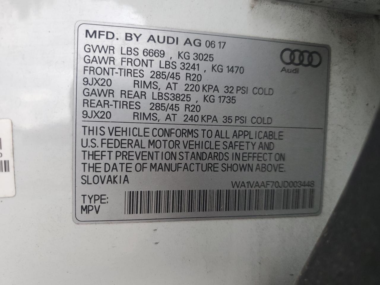 Колір БілийЦиліндри 6Привід Повний привідVIN WA1VAAF70JD003448Стан НевідомоУшкодження Передня або задня