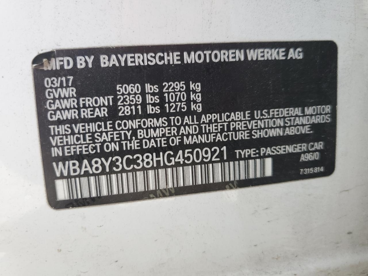 Колір БілийЦиліндри 6Привід Повний привідVIN WBA8Y3C38HG450921Стан НевідомоУшкодження Передня або задня