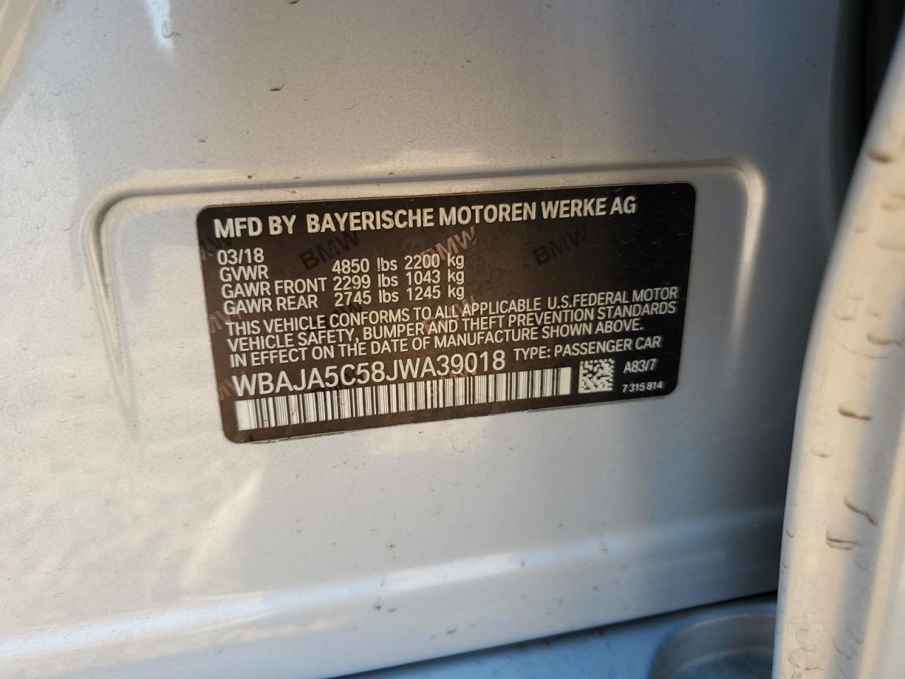 BMW 5 SERIES 2.0 2018 р.в., Задній привід (WBAJA5C58JWA39018) з США