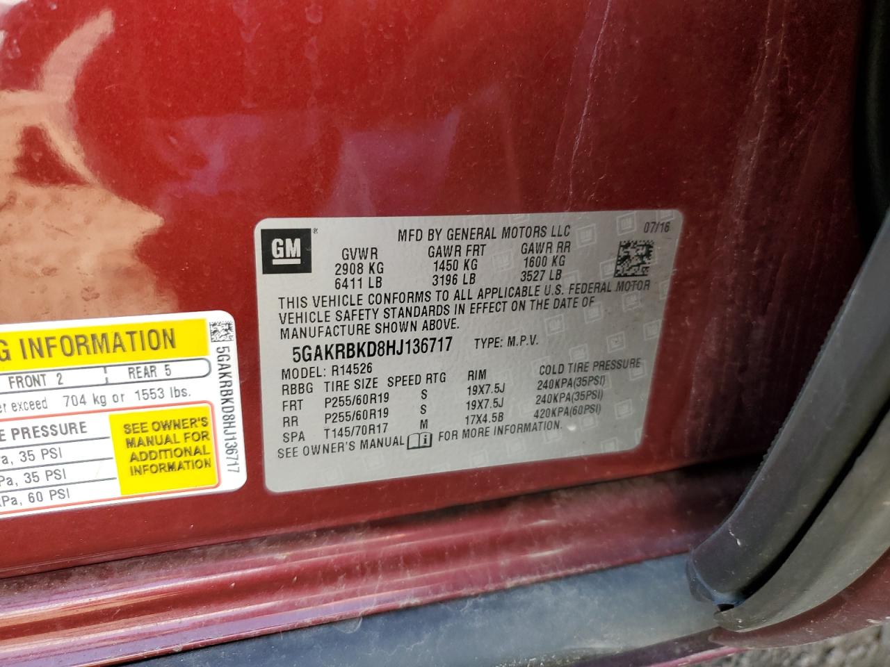 Колір ЧервонийЦиліндри 6VIN 5GAKRBKD8HJ136717Стан Заводиться та їде (перевірено)Ушкодження ЗадняДата аукціону 2025-11-04