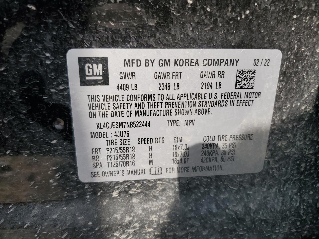 Колір ЧорнийЦиліндри 4Привід Повний привідVIN KL4CJESM7NB522444Стан Заводиться та їде (перевірено)Ушкодження Передня або задняДата аукціону 2025-10-31