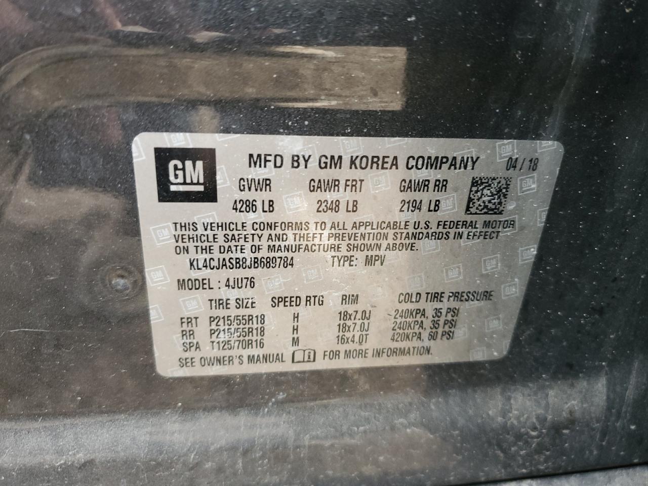 Колір СірийЦиліндри 4VIN KL4CJASB8JB689784Стан НевідомоУшкодження Передня або задня