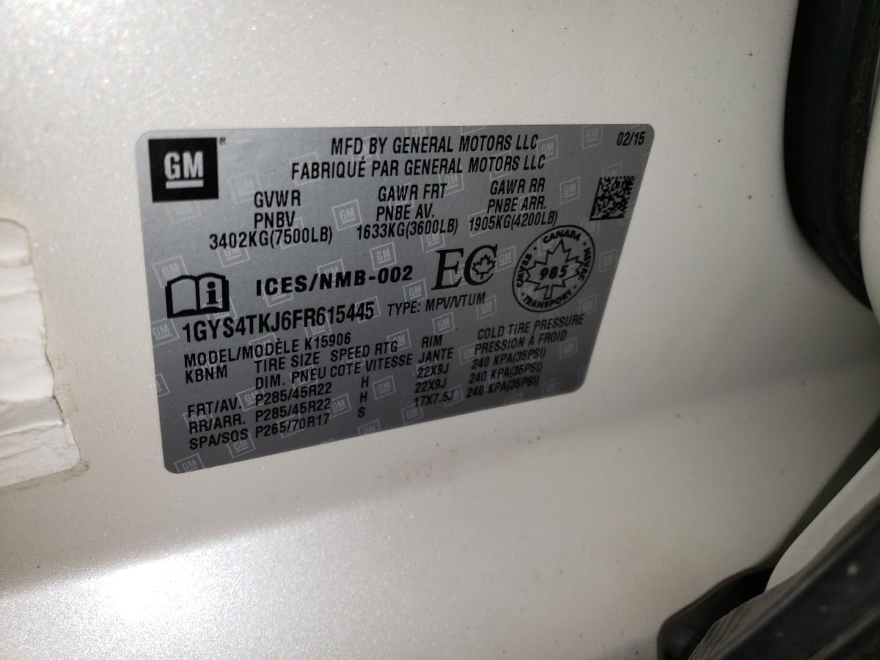 Колір БілийЦиліндри 8Привід 4x4 з заднім приводомVIN 1GYS4TKJ6FR615445Стан Заводиться та їде (перевірено)Ушкодження Звичайний зносДата аукціону 2025-11-04