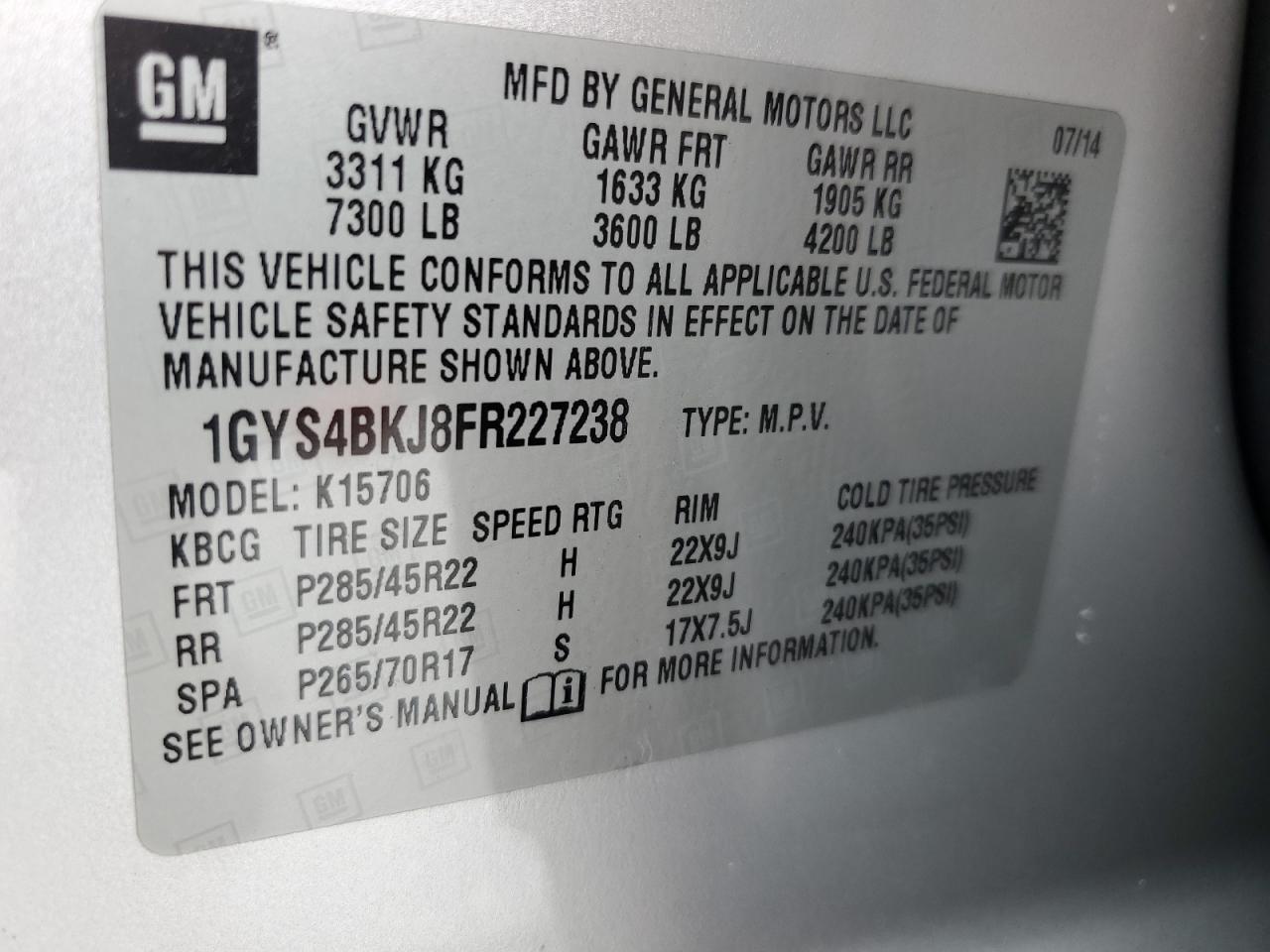 Колір СрібнийЦиліндри 8Привід 4x4 з заднім приводомVIN 1GYS4BKJ8FR227238Стан Заводиться та їде (перевірено)Ушкодження Звичайний зносДата аукціону 2025-11-04