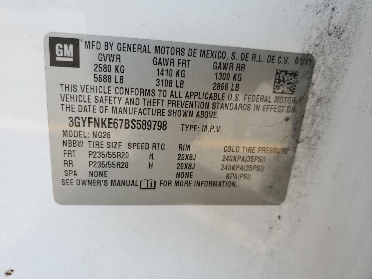 Колір БілийЦиліндри 6Привід Повний привідVIN 3GYFNKE67BS589798Стан НевідомоУшкодження НезначніДата аукціону 2025-11-03