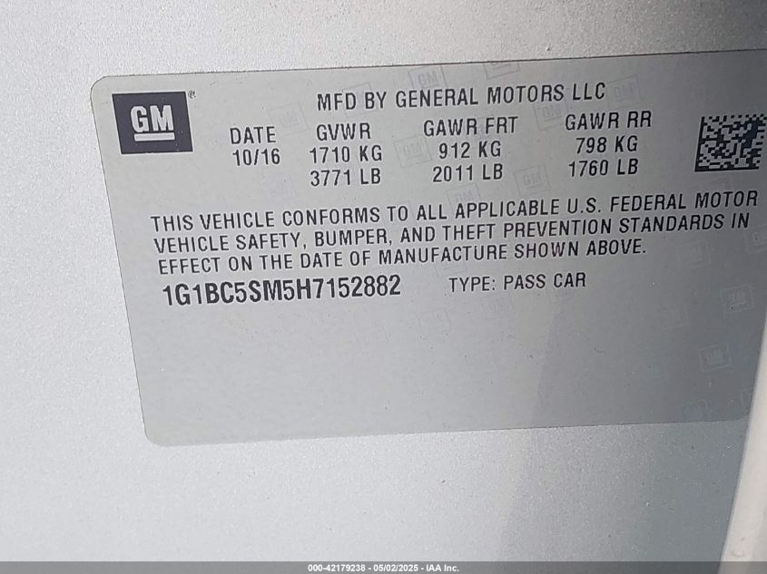 CHEVROLET CRUZE 1.4 2017 р.в., Передній привід (1G1BC5SM5H7152882) з США