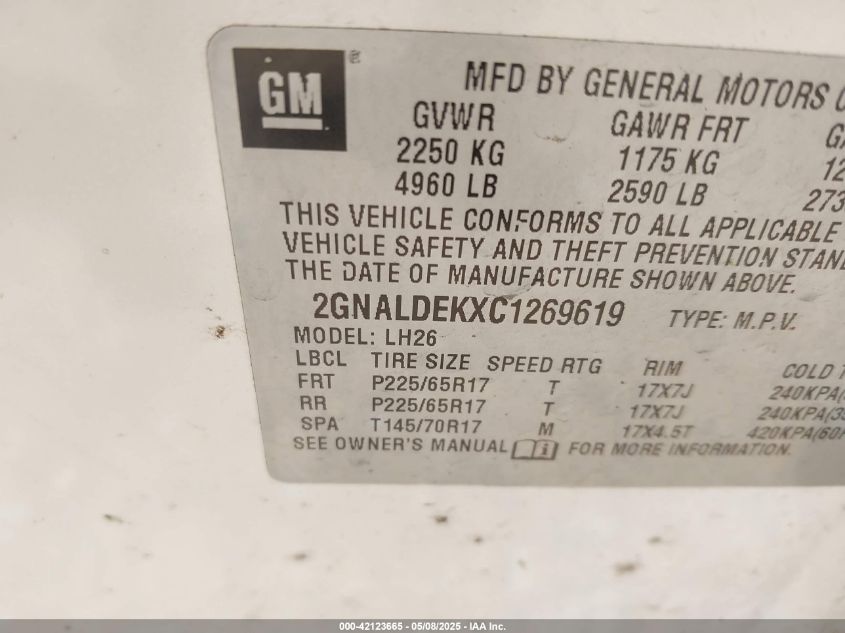 Колір БілийЦиліндри 4Привід Передній привідVIN 2GNALDEKXC1269619Стан СтаціонарноУшкодження Мотор