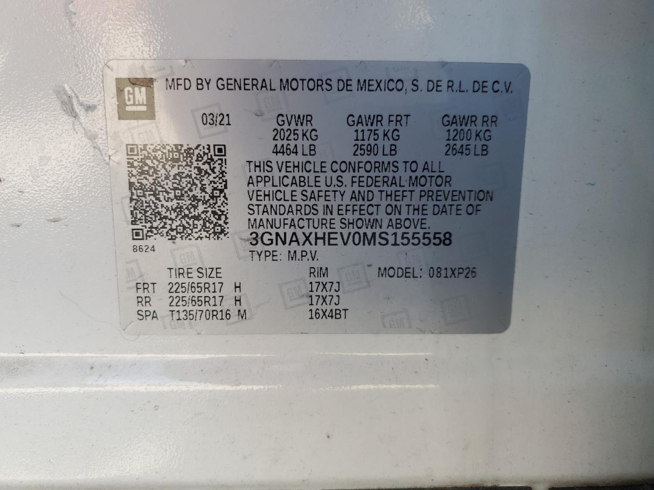 Колір БілийЦиліндри 4VIN 3GNAXHEV0MS155558Стан ЗаводитьсяУшкодження Передня або задня