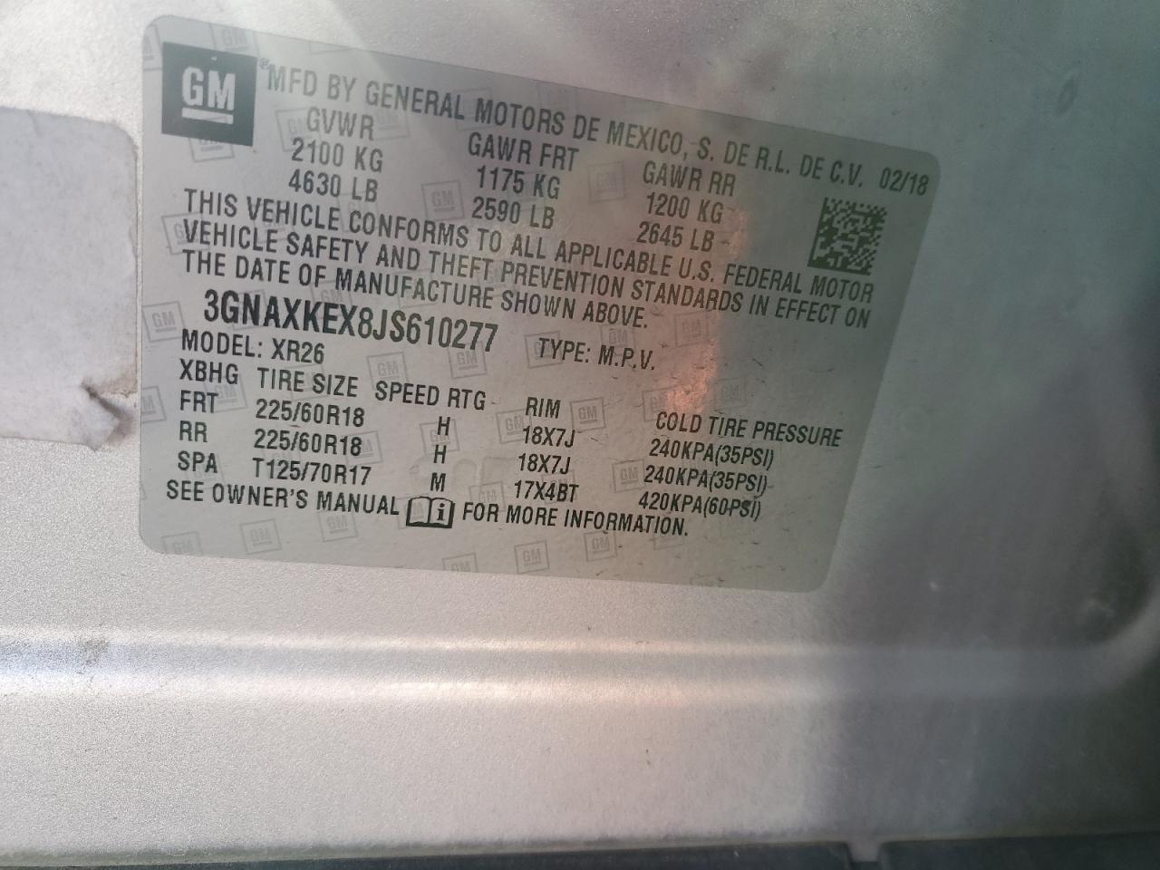 Колір СрібнийЦиліндри 4VIN 3GNAXKEX8JS610277Стан НевідомоУшкодження Передня або задня