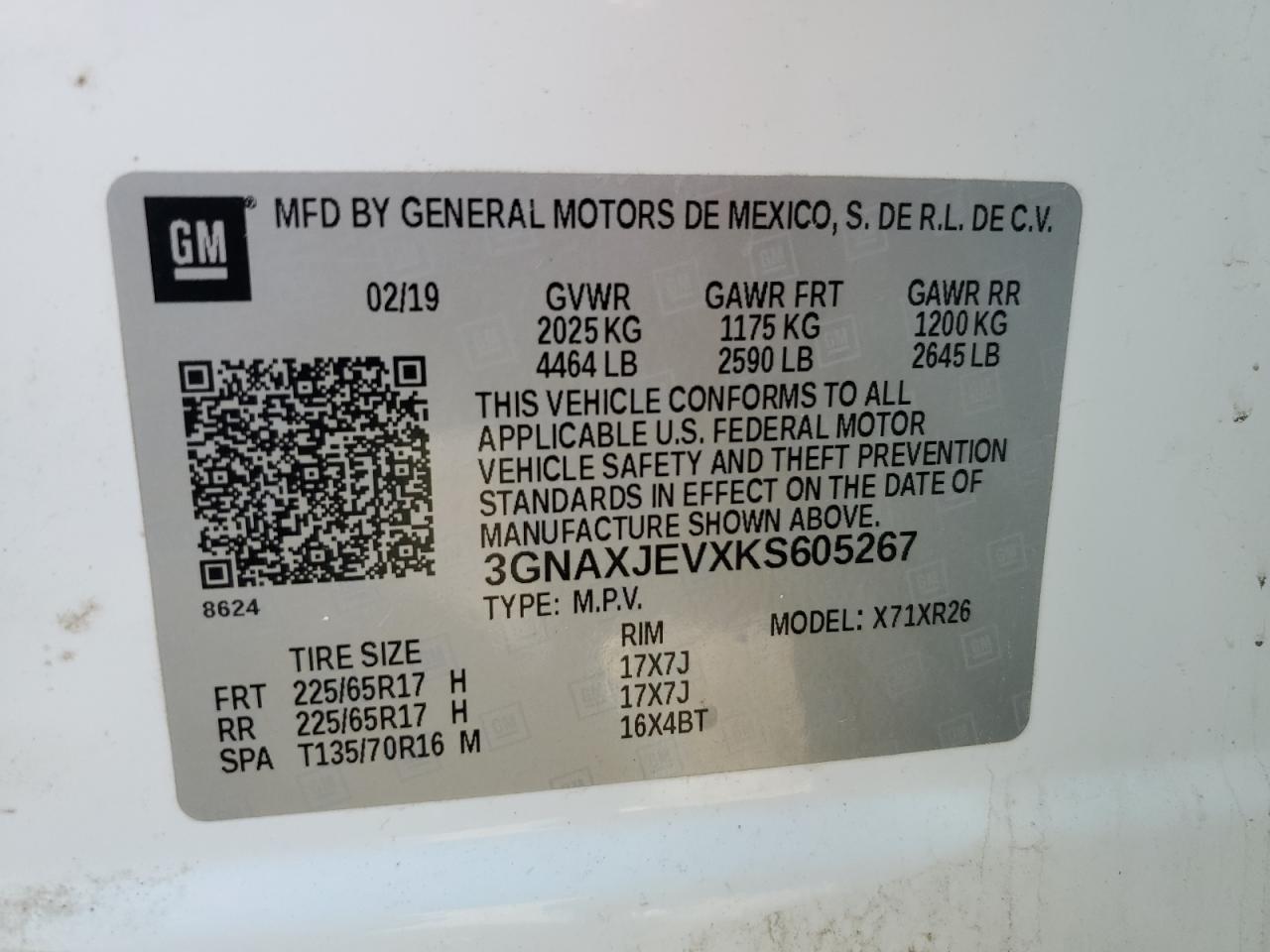 Колір БілийЦиліндри 4VIN 3GNAXJEVXKS605267Стан Заводиться та їде (перевірено)Ушкодження Передня або задня