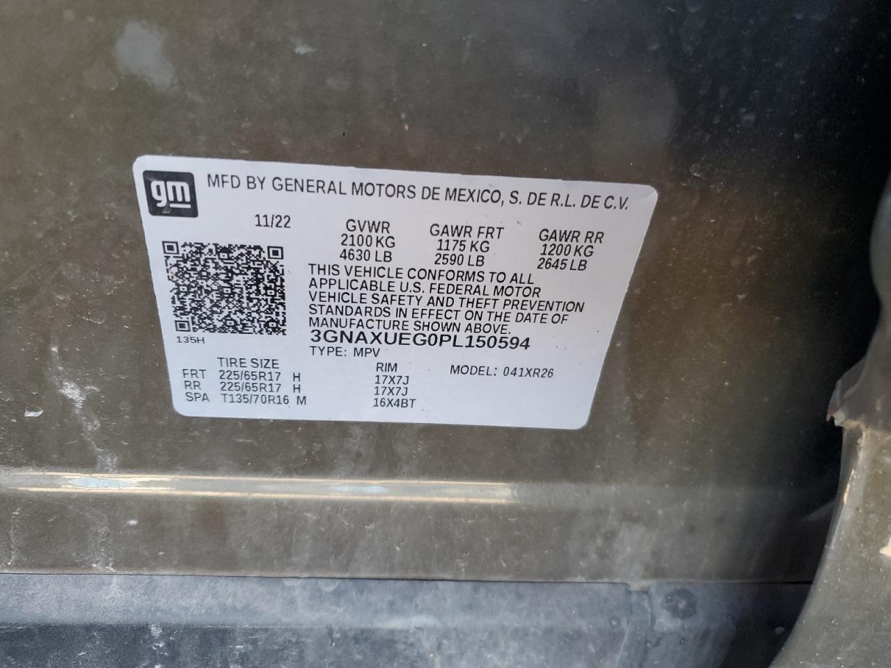 Колір Деревне вугілляЦиліндри 4Привід Повний привідVIN 3GNAXUEG0PL150594Стан Заводиться та їде (перевірено)Ушкодження З боківДата аукціону 2025-11-03