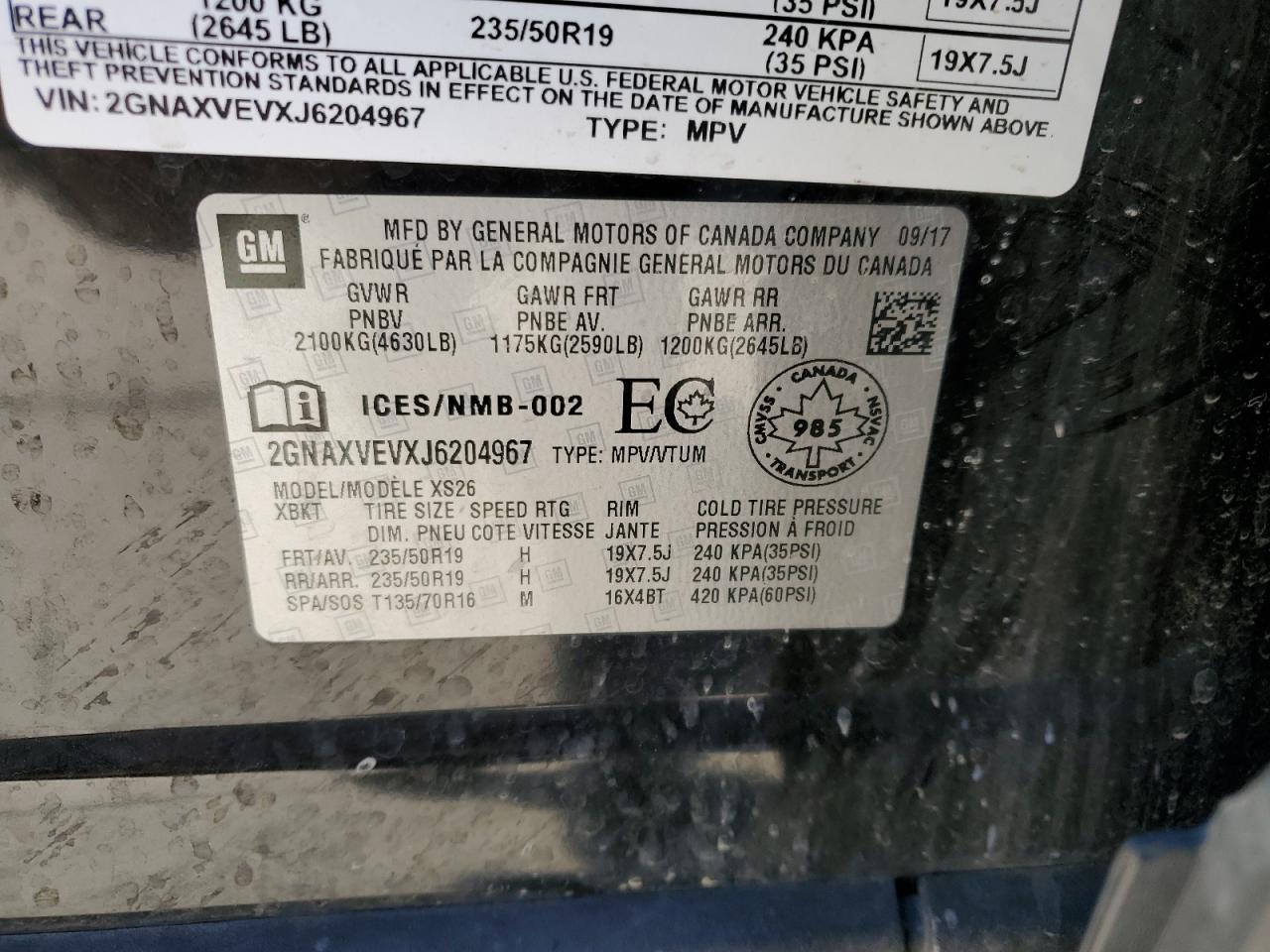 Колір ЧорнийЦиліндри 4Привід Повний привідVIN 2GNAXVEVXJ6204967Стан Заводиться та їде (перевірено)Ушкодження Передня або задняДата аукціону 2025-11-03