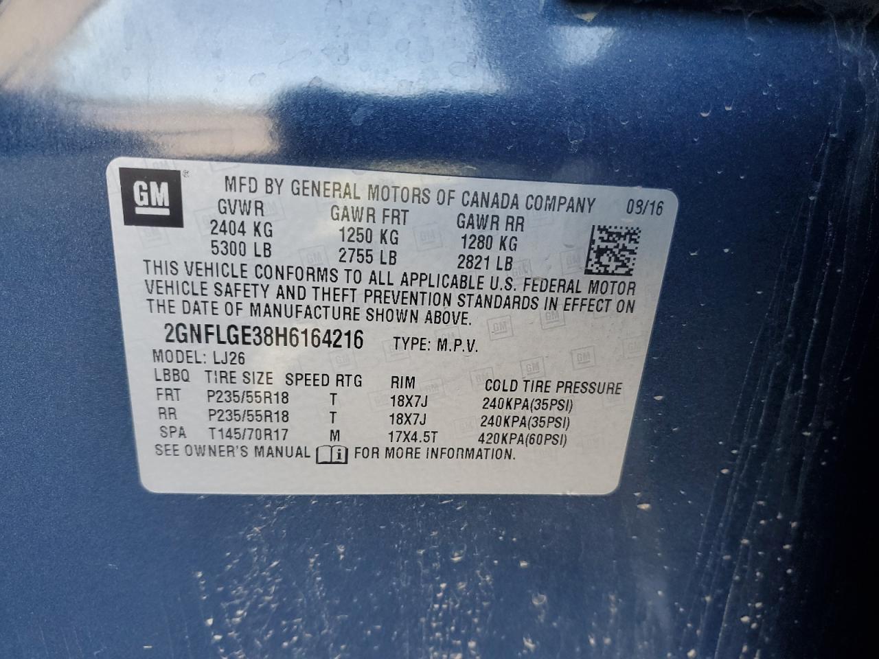 Колір СинійЦиліндри 6Привід Повний привідVIN 2GNFLGE38H6164216Стан НевідомоУшкодження Передня або задня