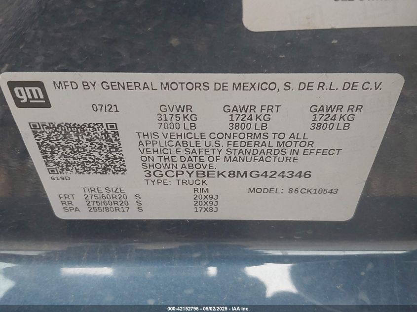 CHEVROLET SILVERADO 1500 2.7 2021 р.в., Повний привід (3GCPYBEK8MG424346) з США