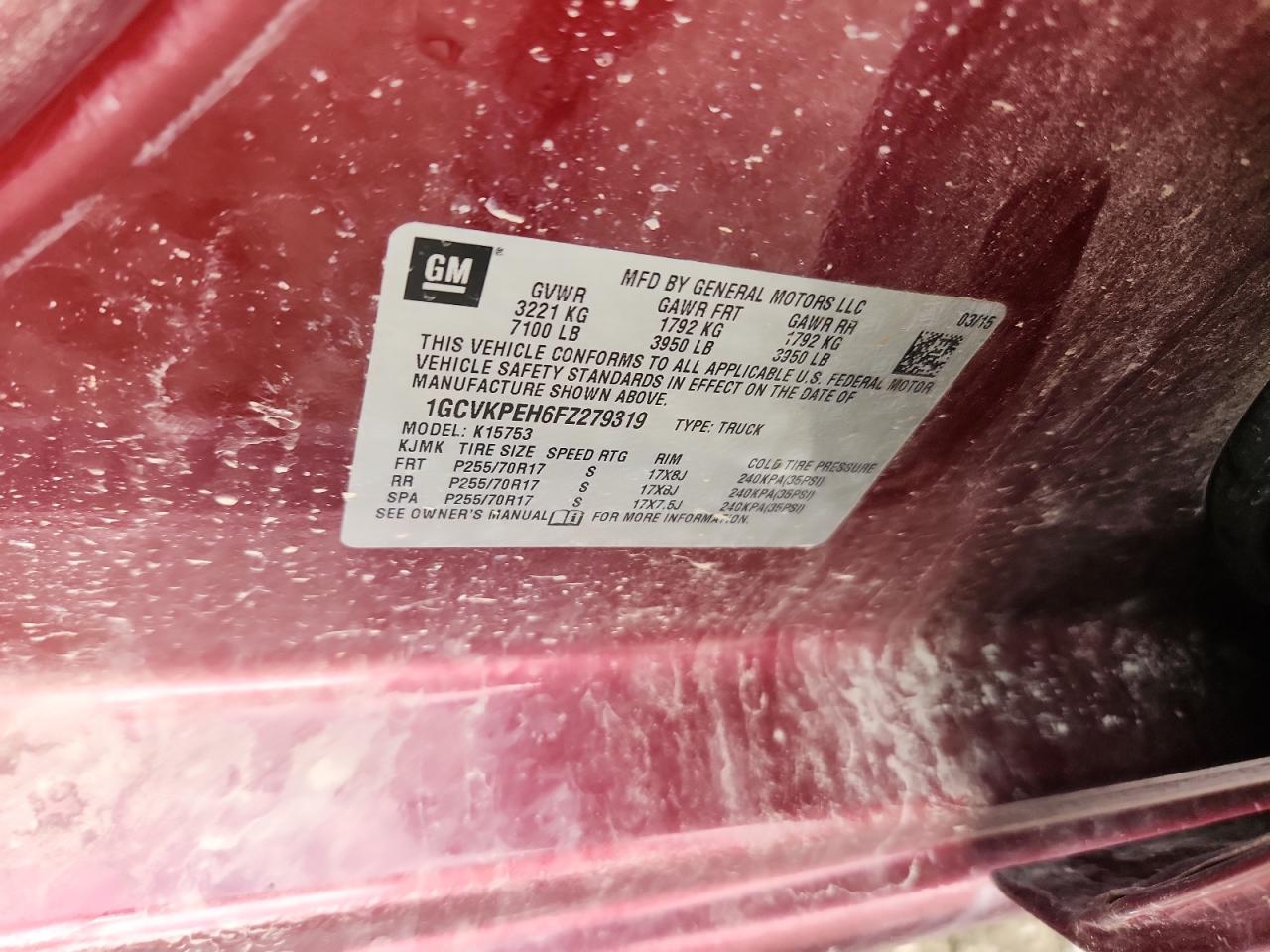 Колір БургундіяЦиліндри 6Привід 4x4 з заднім приводомVIN 1GCVKPEH6FZ279319Стан Заводиться та їде (перевірено)Ушкодження Передня або задня