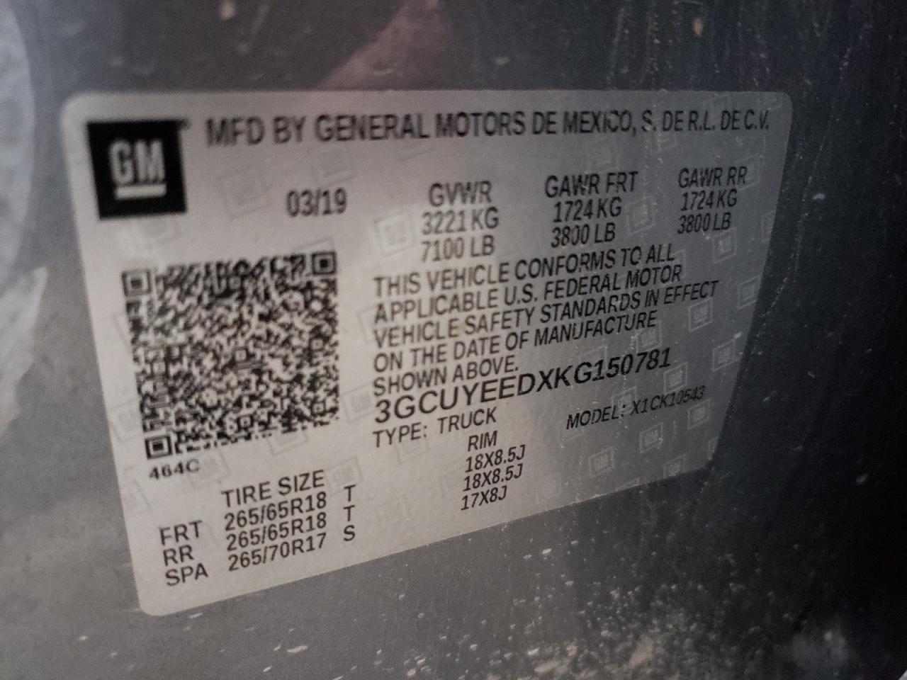 Колір СірийЦиліндри 8Привід 4x4 з заднім приводомVIN 3GCUYEEDXKG150781Стан Заводиться та їде (перевірено)Ушкодження ЗадняДата аукціону 2025-11-12