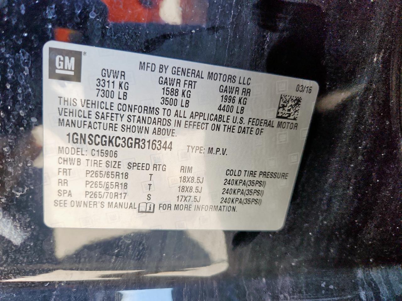 CHEVROLET SUBURBAN 5.3 2016 р.в., Задній привід (1GNSCGKC3GR316344) з США