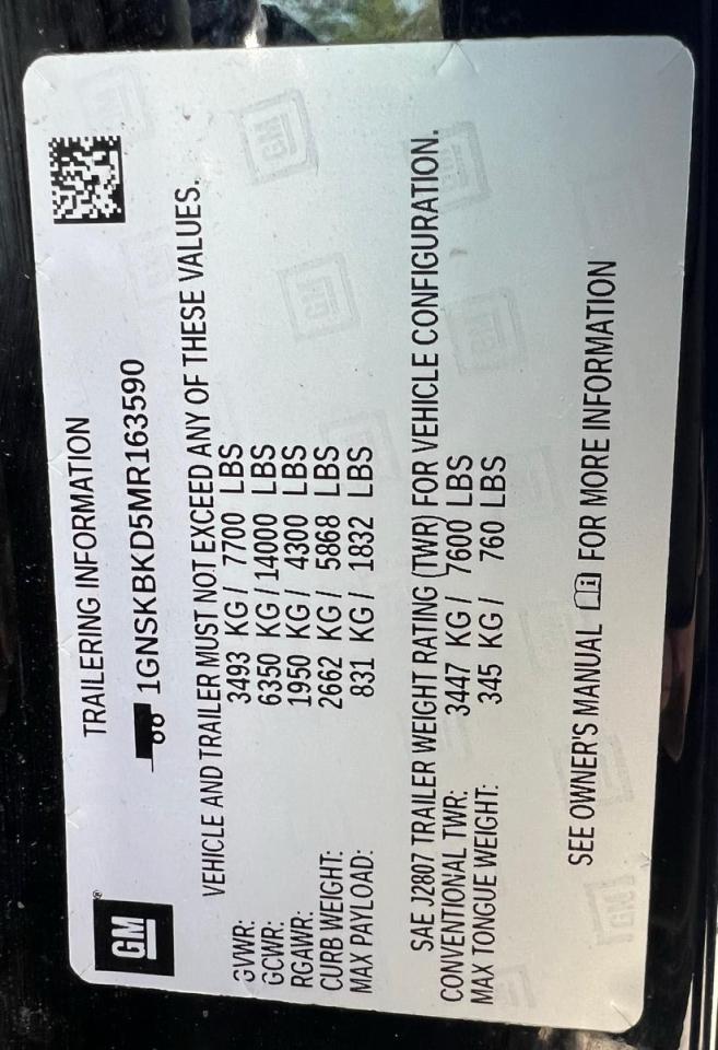 CHEVROLET SUBURBAN 5.3 2021 р.в., 4x4 з заднім приводом (1GNSKBKD5MR163590) з США