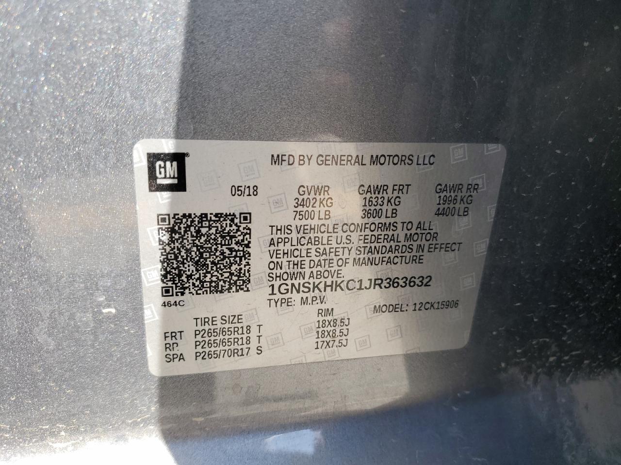 CHEVROLET SUBURBAN 5.3 2018 р.в., 4x4 з заднім приводом (1GNSKHKC1JR363632) з США