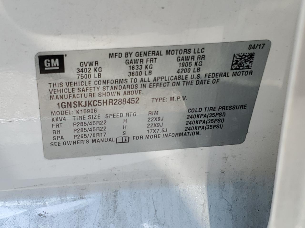CHEVROLET SUBURBAN 5.3 2017 р.в., 4x4 з заднім приводом (1GNSKJKC5HR288452) з США