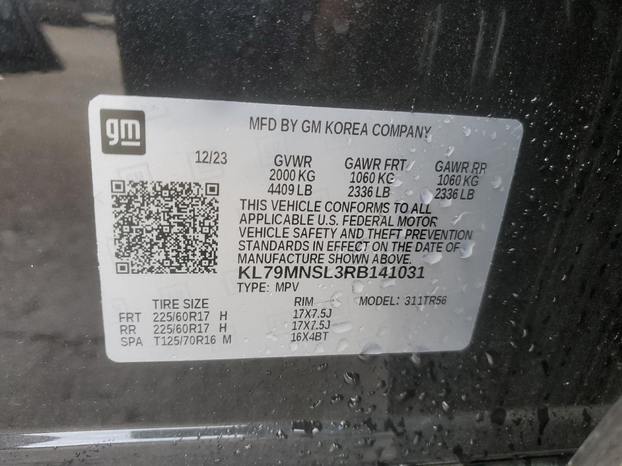 Колір ЧорнийЦиліндри 3Привід Повний привідVIN KL79MNSL3RB141031Стан Заводиться та їде (перевірено)Ушкодження З боківДата аукціону 2025-11-04