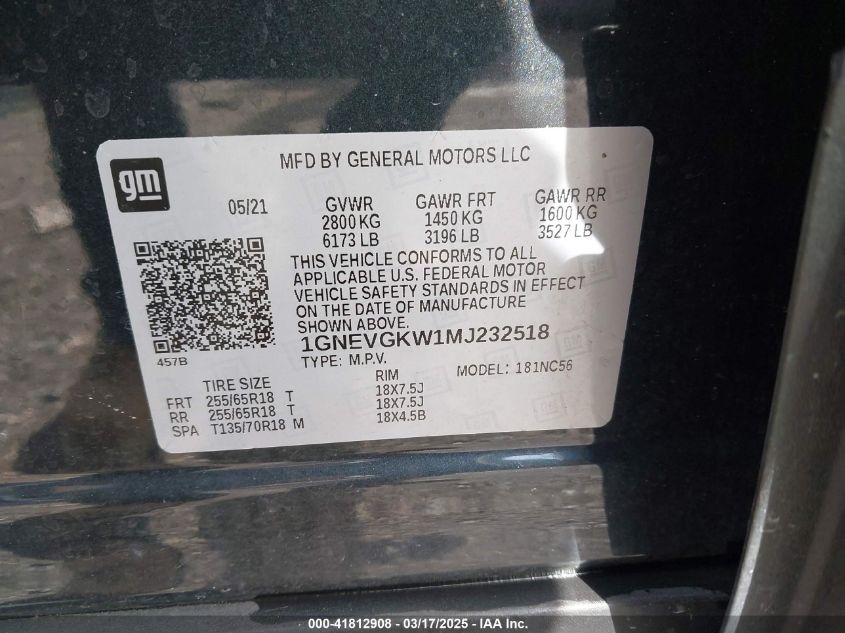 CHEVROLET TRAVERSE 3.6 2021 р.в., Повний привід (1GNEVGKW1MJ232518) з США