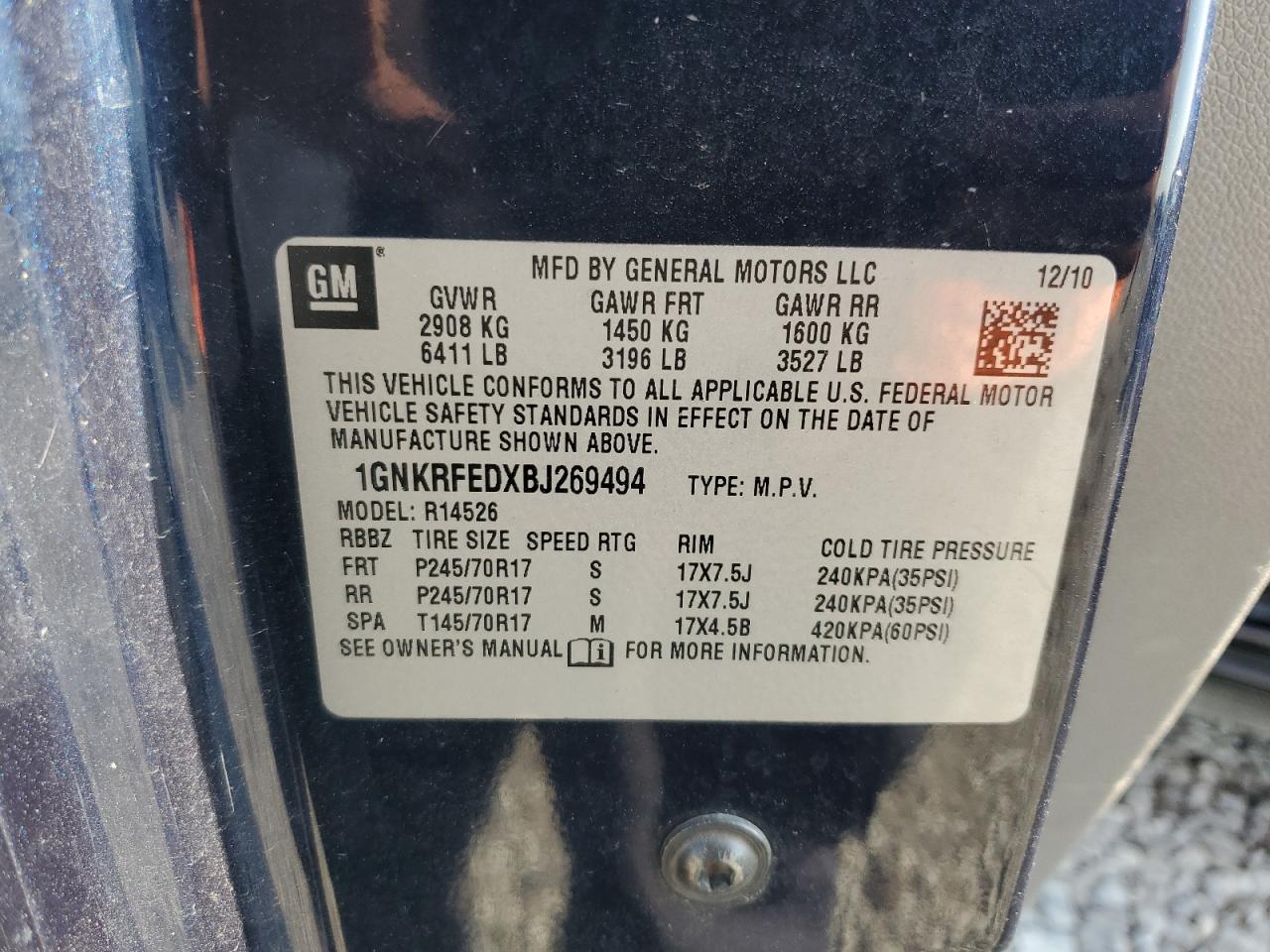 Колір СинійЦиліндри 6VIN 1GNKRFEDXBJ269494Стан Заводиться та їде (перевірено)Ушкодження Задня