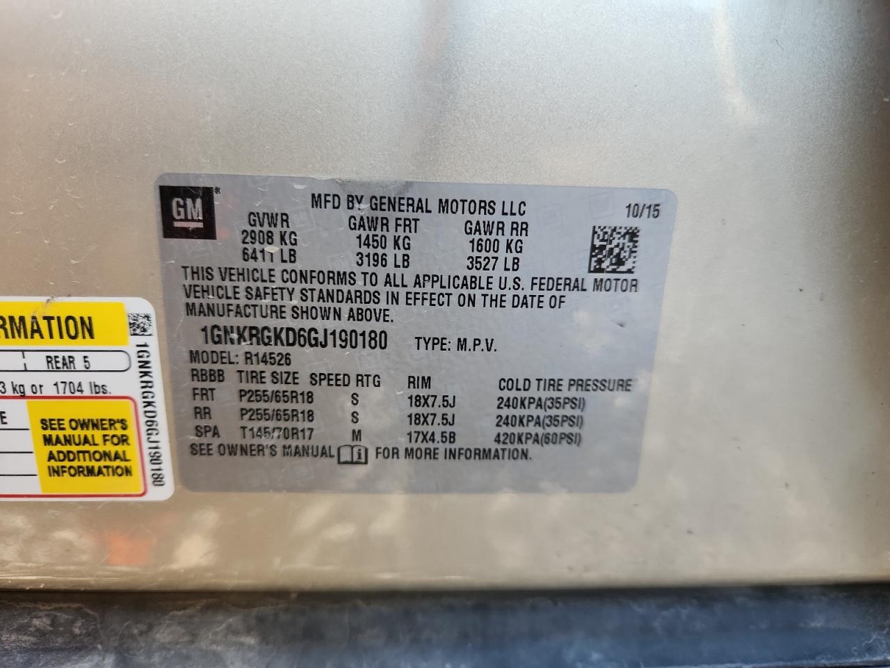 Колір ЗолотийЦиліндри 6VIN 1GNKRGKD6GJ190180Стан Заводиться та їде (перевірено)Ушкодження ЗадняДата аукціону 2025-11-03