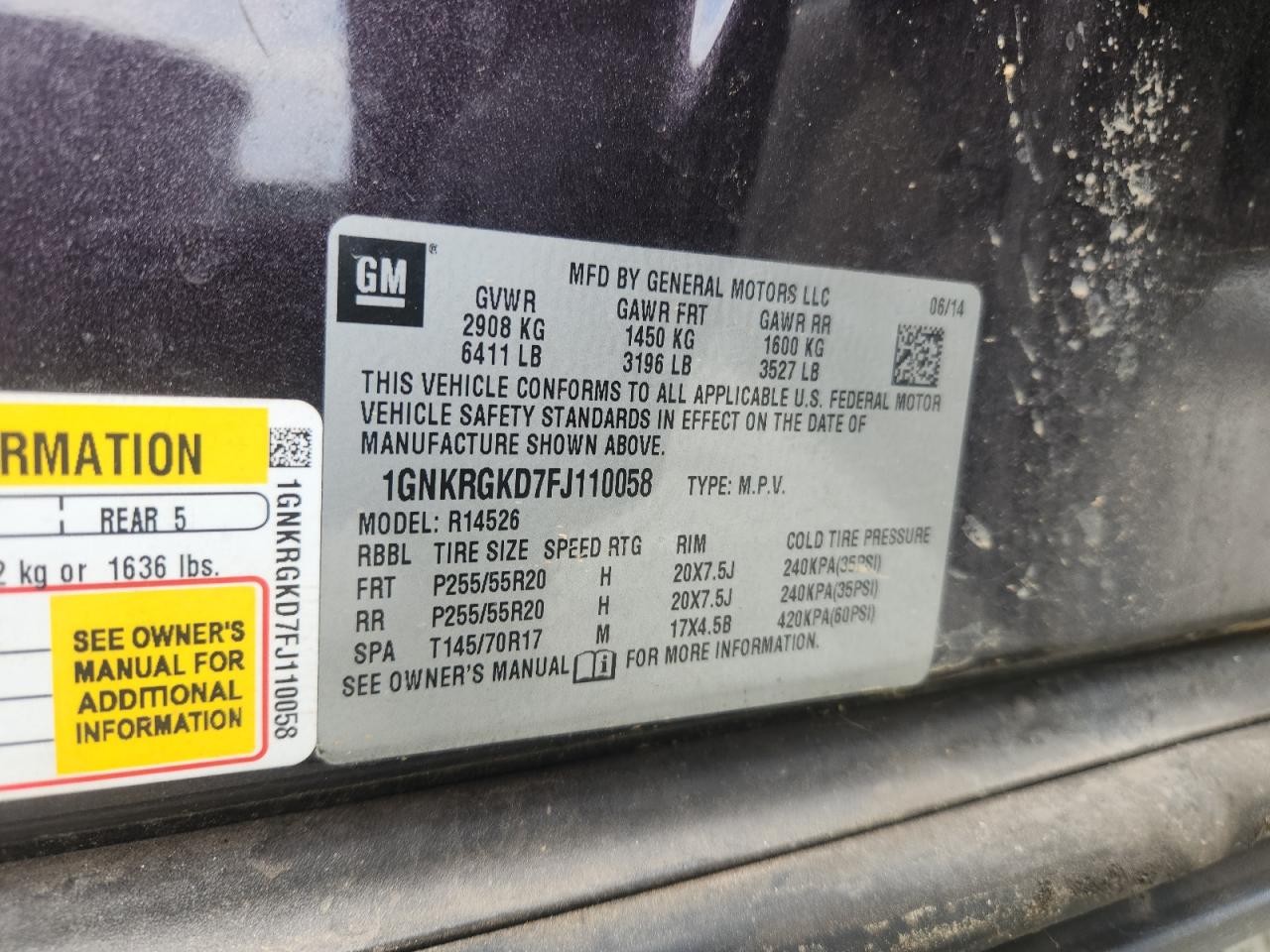 Колір ЧорнийЦиліндри 6VIN 1GNKRGKD7FJ110058Стан НевідомоУшкодження Передня або задня