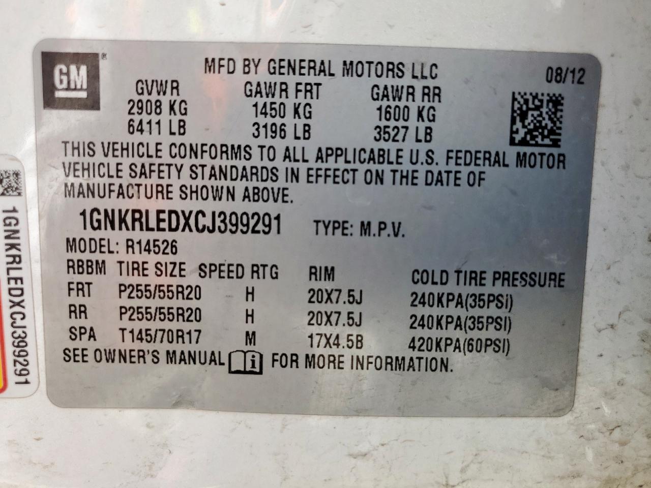 Колір БілийЦиліндри 6VIN 1GNKRLEDXCJ399291Стан Заводиться та їде (перевірено)Ушкодження Передня або задня