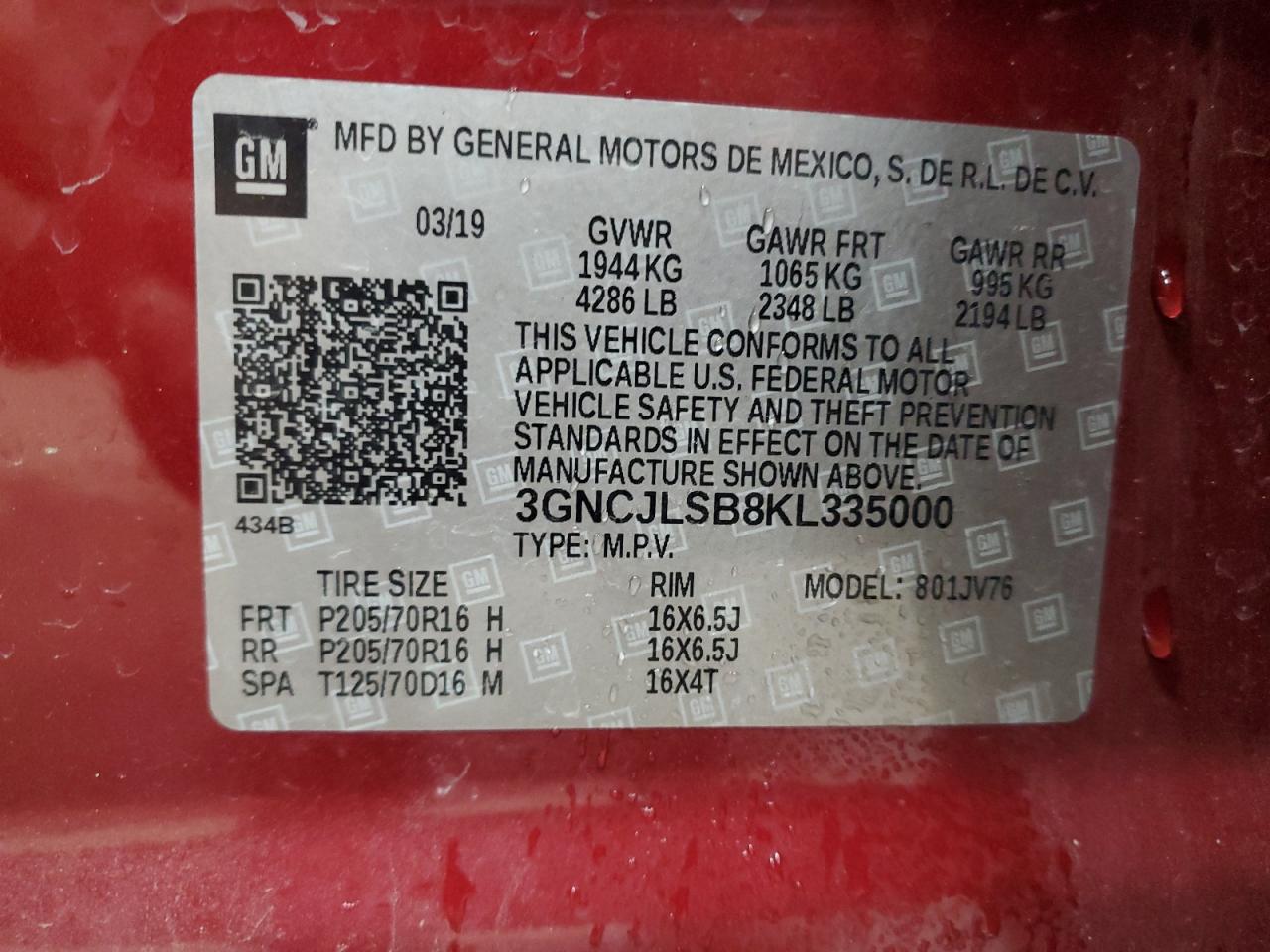 Колір БургундіяЦиліндри 4VIN 3GNCJLSB8KL335000Стан ЗаводитьсяУшкодження Передня або задня