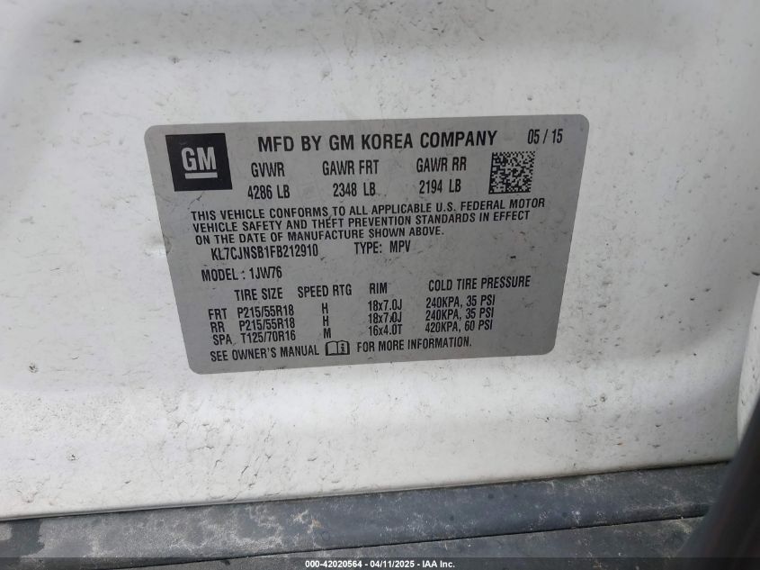 CHEVROLET TRAX 1.4 2015 р.в., Передній привід (KL7CJNSB1FB212910) з США