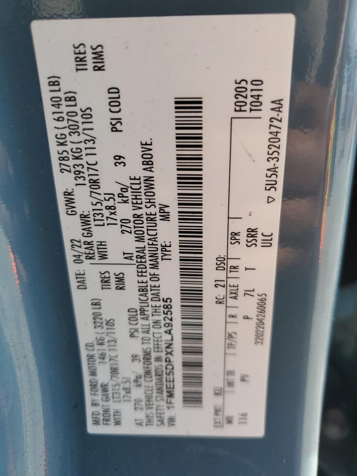 Колір СинійЦиліндри 6Привід Повний привідVIN 1FMEE5DPXNLA92585Стан НевідомоУшкодження Передня або задня