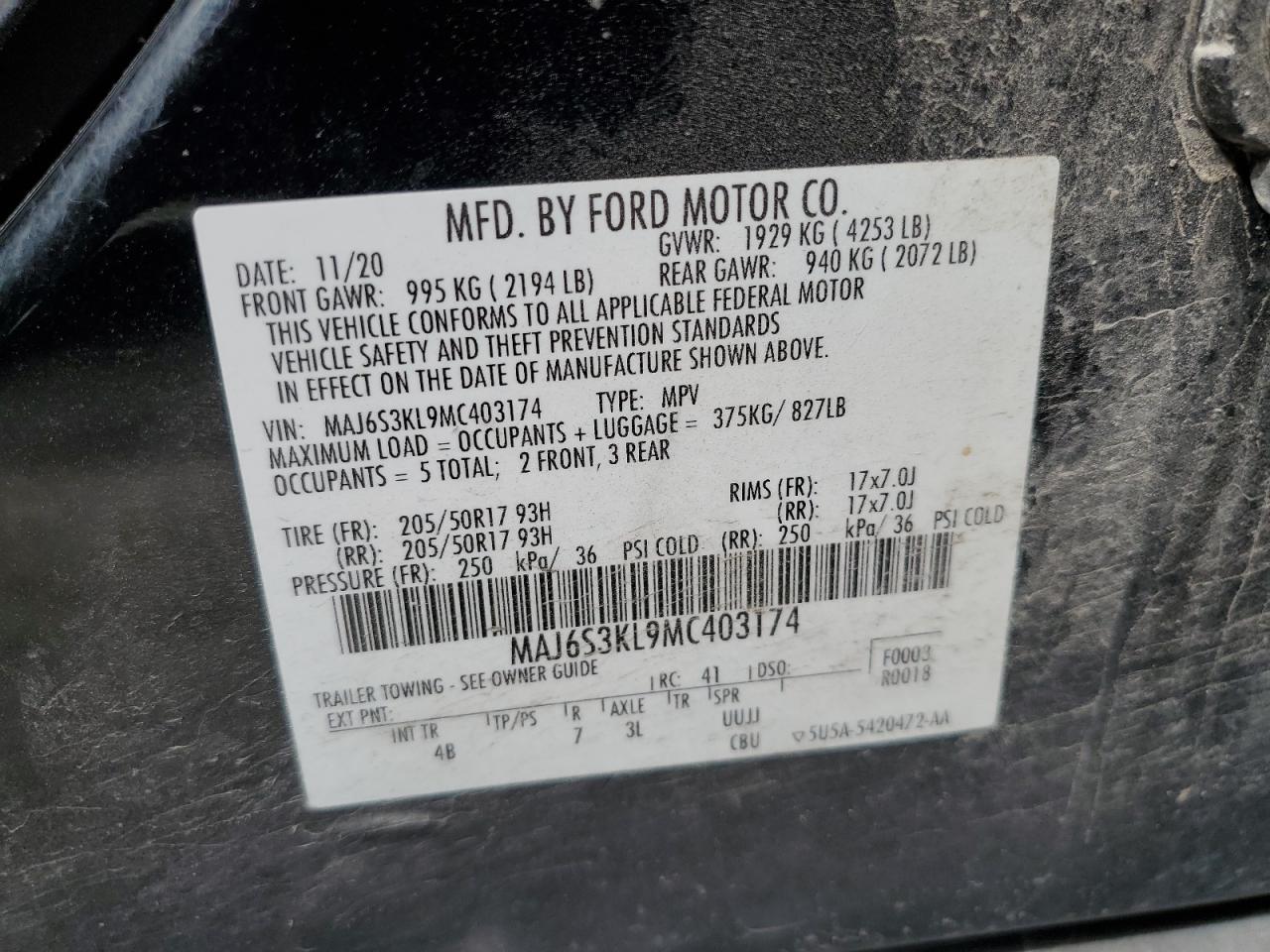 FORD ECOSPORT 2.0 2021 р.в., 4x4 з переднім приводом (MAJ6S3KL9MC403174) з США