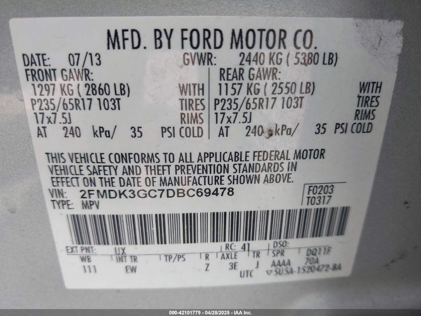 Колір СрібнийЦиліндри 6Привід Передній привідVIN 2FMDK3GC7DBC69478Стан СтаціонарноУшкодження З боків