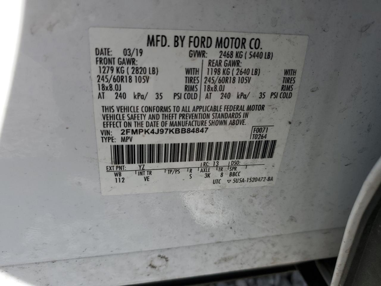 Колір БілийЦиліндри 4Привід Повний привідVIN 2FMPK4J97KBB84847Стан ЗаводитьсяУшкодження Передня або задняДата аукціону 2025-11-03