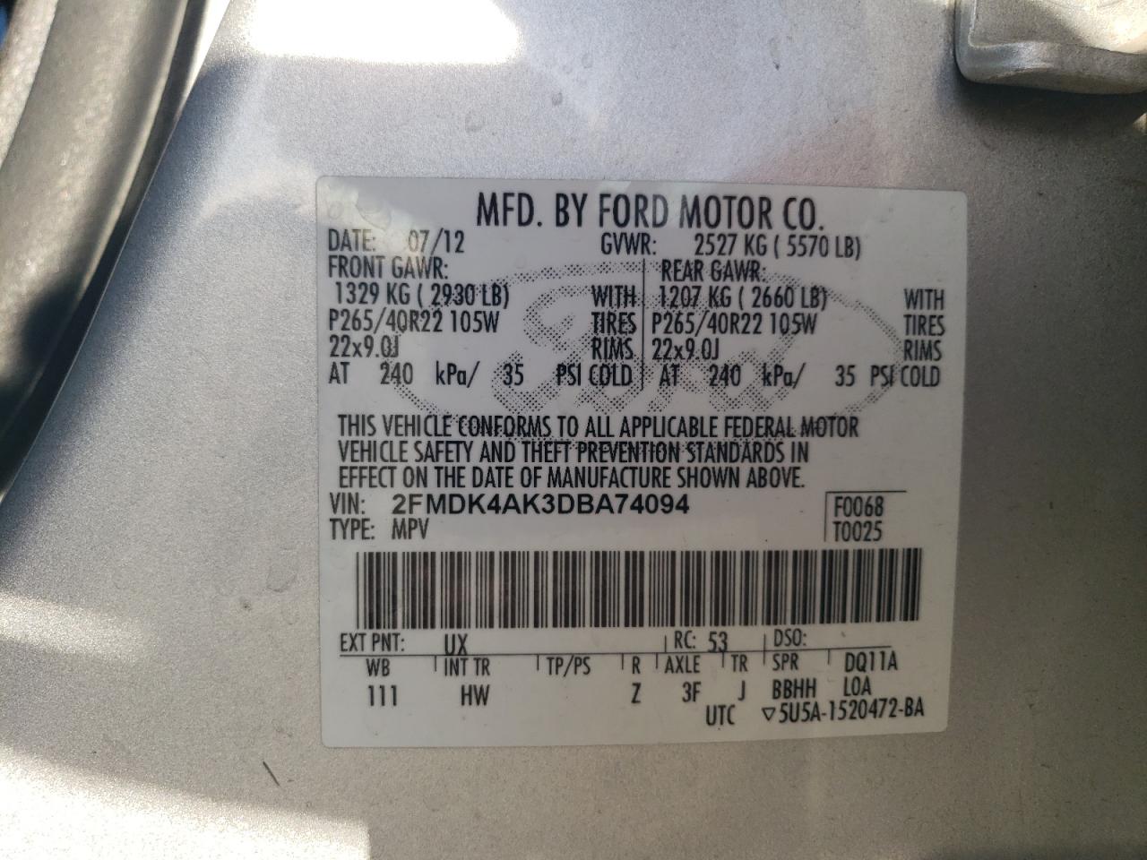 Колір СрібнийЦиліндри 6Привід Повний привідVIN 2FMDK4AK3DBA74094Стан Заводиться та їде (перевірено)Ушкодження Передня або задня