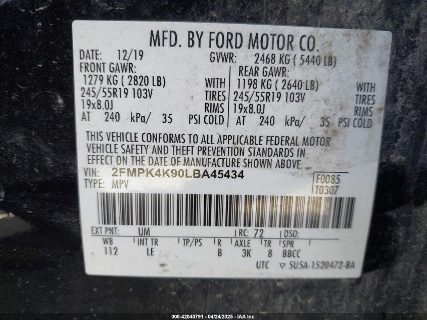 FORD EDGE 2.0 2020 р.в., Повний привід (2FMPK4K90LBA45434) з США