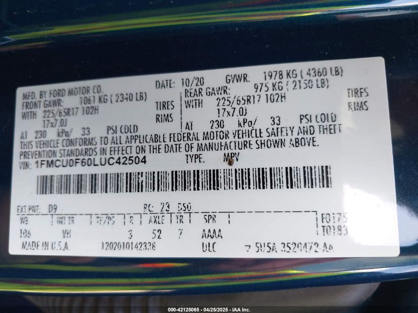 FORD ESCAPE 1.5 2020 р.в., Передній привід (1FMCU0F60LUC42504) з США