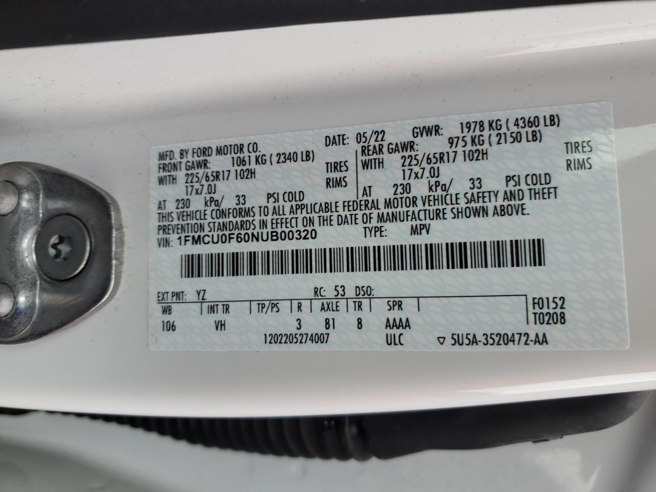 Колір БілийЦиліндри 3VIN 1FMCU0F60NUB00320Стан ЗаводитьсяУшкодження Механічні пошкодженняДата аукціону 2025-11-10