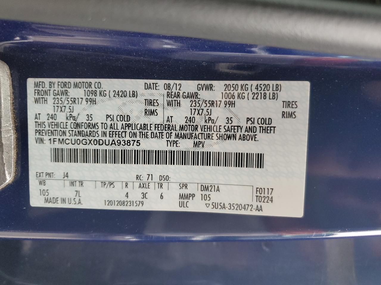 Колір СинійЦиліндри 4VIN 1FMCU0GX0DUA93875Стан Заводиться та їде (перевірено)Ушкодження НезначніДата аукціону 2025-11-04