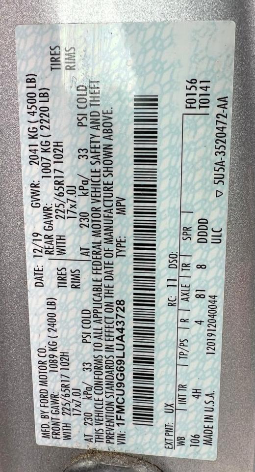 FORD ESCAPE 1.5 2020 р.в., 4x4 з переднім приводом (1FMCU9G69LUA43728) з США