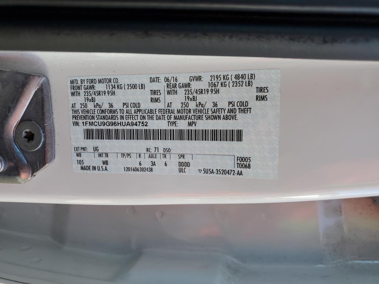 FORD ESCAPE 2.0 2017 р.в., 4x4 з переднім приводом (1FMCU9G96HUA94752) з США