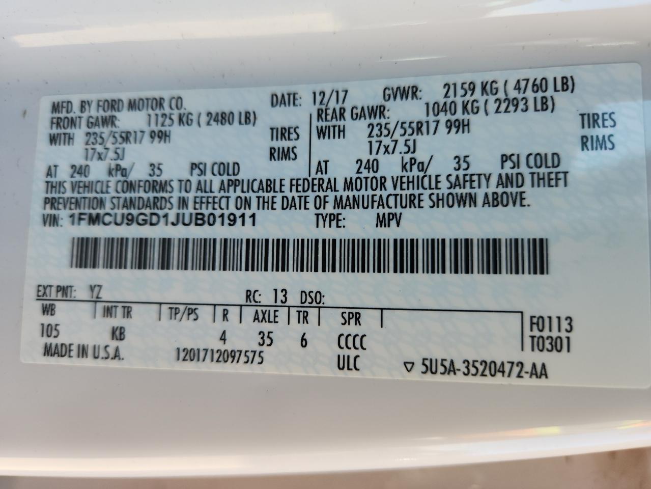Колір БілийЦиліндри 4Привід 4x4 з переднім приводомVIN 1FMCU9GD1JUB01911Стан НевідомоУшкодження Передня або задня